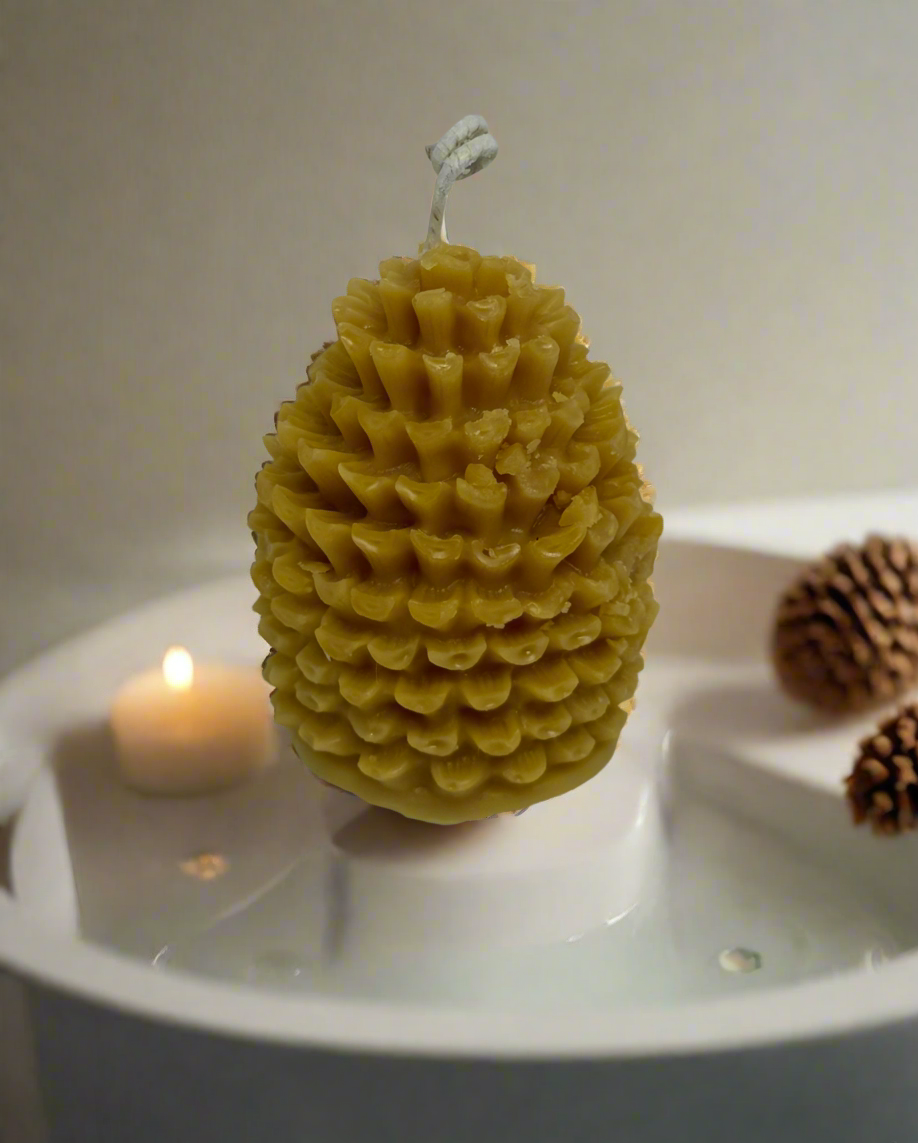 This uniquely shaped candle emits a warming mahogany teakwood scent, perfect for creating a cozy and inviting atmosphere. The candle comes with a complimentary holder for easy display and added protection. Enjoy the fragrant benefits of this beautiful pine cone candle.